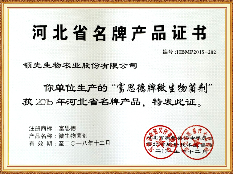 富思德牌微生物菌劑—河北省名牌產(chǎn)品證書(shū)